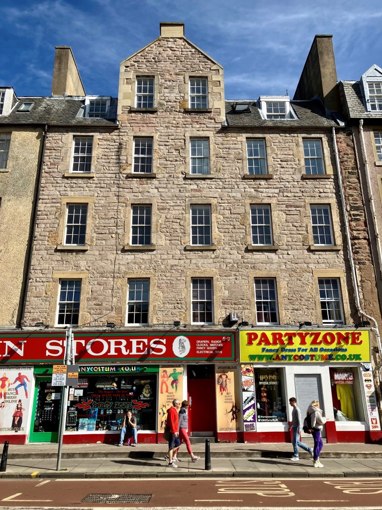 10 St Patrick Square, Edinburgh: built in 1796. Four floors of flats over Edinburgh Bargain Stores and Partyzone, where you can buy werewolf masks for Halloween and inflatable naked men for hen parties.